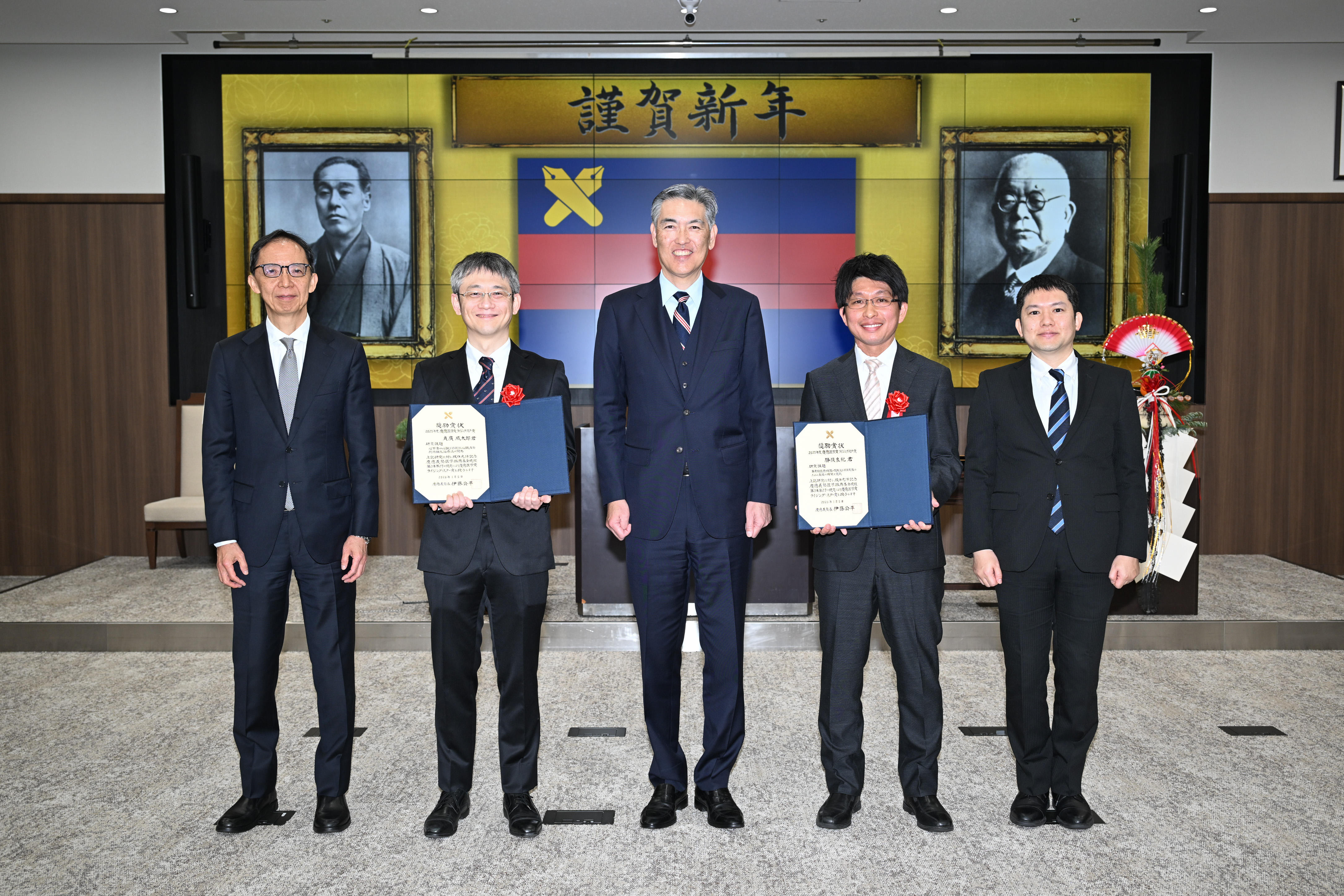 新年祝賀式と併せて「坂口光洋記念慶應義塾医学振興基金」に基づく慶應医学賞 ライジング・スター賞授賞式が行われ、内科学(循環器)助教 貞廣威太郎君と、スポーツ医学総合センター専任講師 勝俣良紀君の2名が受賞しました。